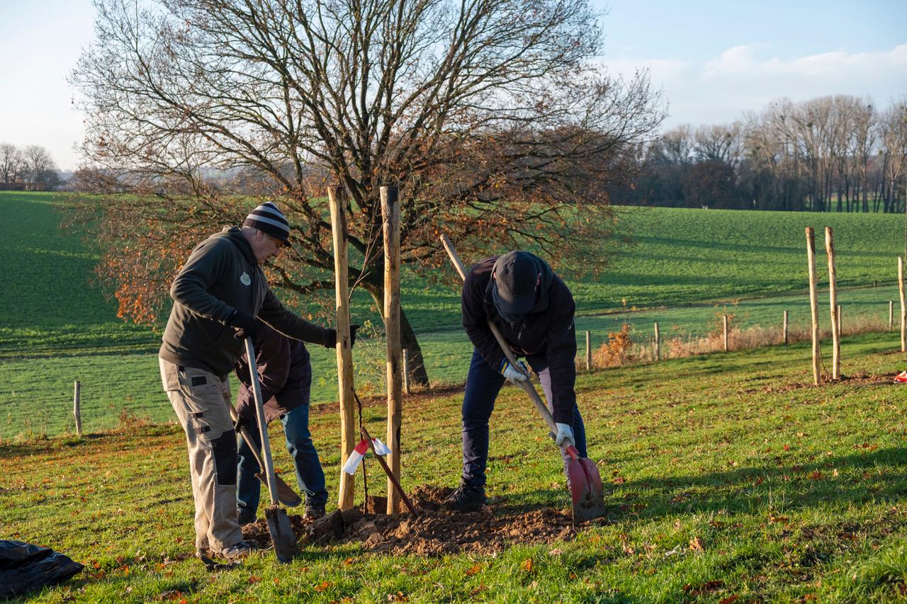 Onder een heerlijk najaarszonnetje hebben afgelopen zaterdag de vrijwilligers van de Stichting Sjweikeser Rengelaot een 90 tal hoogstambomen geplant. Het overgrote deel bestaat uit de welbekende Sjweikeser rengelaot aangevuld met zogenaamde bestuivers. Hierdoor is het gebied aan de Vloedsgraaf compleet en in totaal fleuren ruim 500 bomen, verdeeld over 7 percelen, dit heerlijke pruimenras Sweikhuizen op. Als het ware door een witte sjaal wordt Sweikhuizen in het voorjaar omgeven en diverse bloesemwandeltochten worden dan uitgezet.