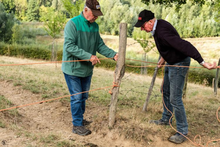Na 8 jaar worden de boompjes uitgeplant op onze percelen. Hiervoor wordt het plantgat gemaakt, de boom geplant, de steunpalen en de beschermingsdraad geplaatst.